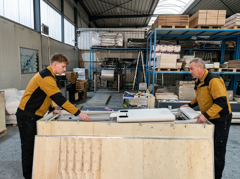 Les équipements sont ensuite nettoyés, protégés et emballés avec soin afin de garantir une protection optimale pendant le transport et une installation rapide à l’arrivée.